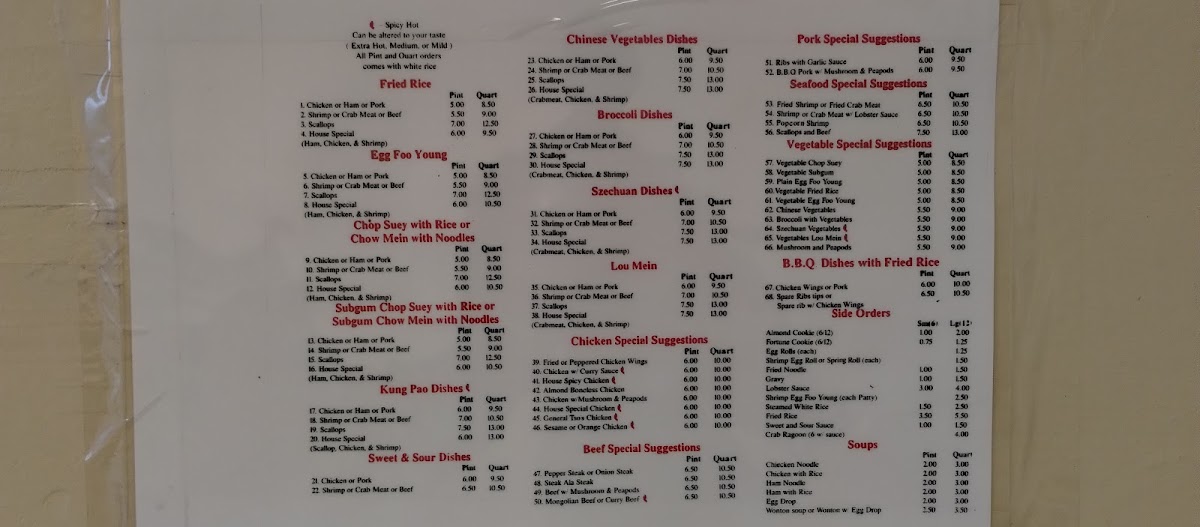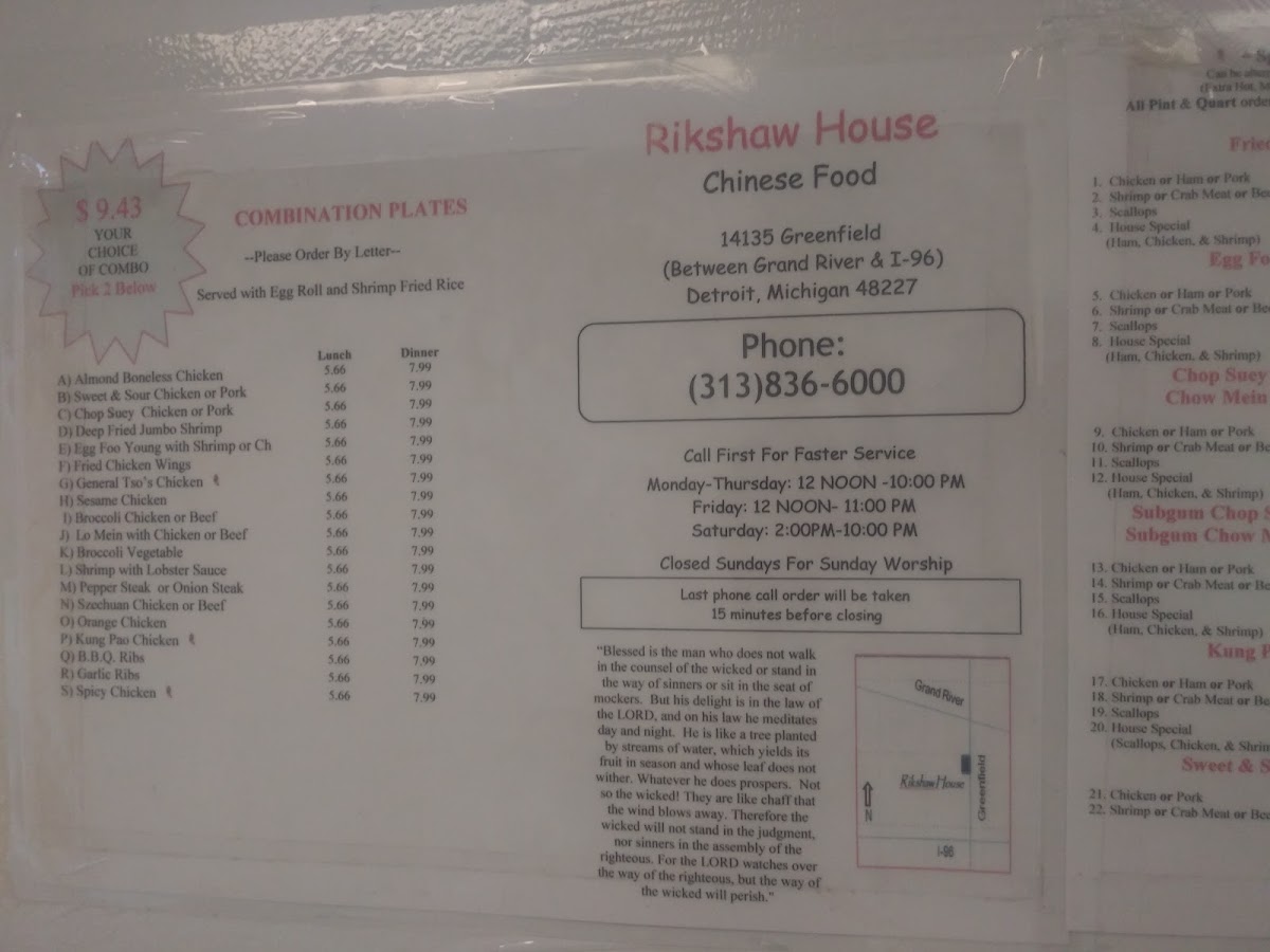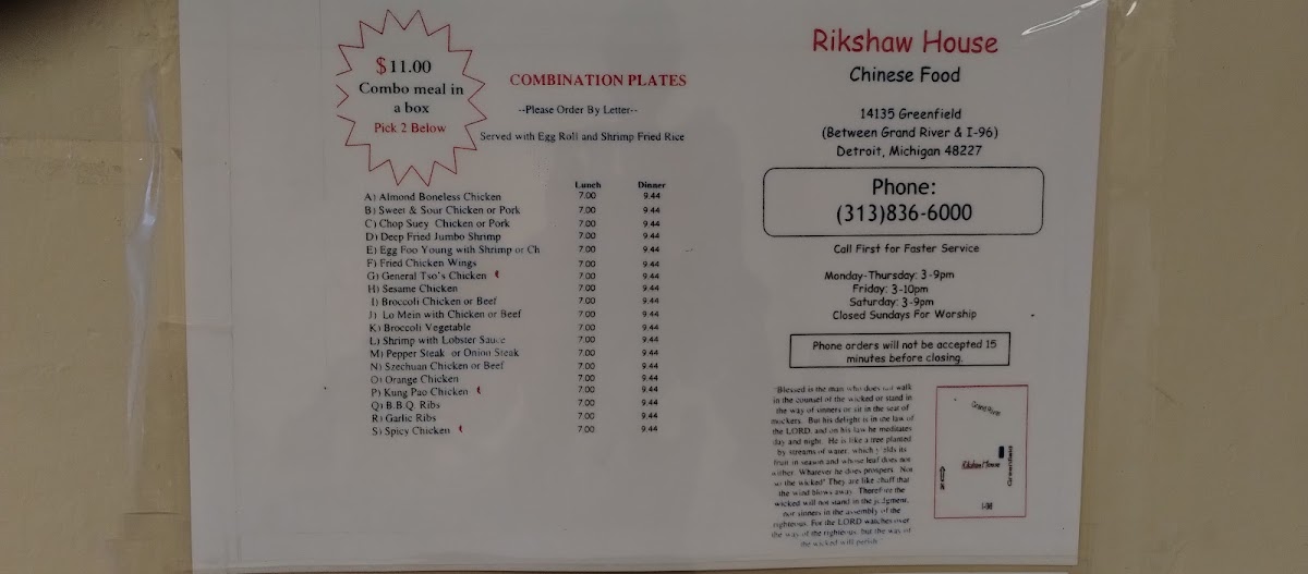 From a reviewer’s perspective, the menu at Rikshaw House, located at 14135 Greenfield Rd, Detroit, MI 48227, feels like a well-rounded conclusion to a classic Chinese-American dining experience-one that prioritizes variety, familiarity, and generous choice. The foundation of the menu is built around staples like Fried Rice, Egg Foo Young, and Chop Suey with Rice or Chow Mein with Noodles, each thoughtfully offered with proteins ranging from chicken, ham, or pork to shrimp, crab meat, beef, and even premium options like lobster, scallops, or a House Special. This same flexible approach continues through Subgum Chop Suey or Subgum Chow Mein, Kung Pao Dishes, Sweet and Sour Dishes, Chinese Vegetables Dishes, Broccoli Dishes, Szechuan Dishes, and Lo Mein, allowing diners to customize their meals while staying within familiar flavor profiles. The menu truly shines in its “Special Suggestions,” where comfort meets indulgence-standouts include Fried Chicken Wings, Peppered Chicken Wings, Almond Boneless Chicken, Mongolian Beef, Pepper Steak, Ribs with Garlic Sauce, and seafood-focused plates such as Shrimp with Lobster Sauce, Popcorn Shrimp, and Lobster Meat. Vegetarian diners are not overlooked, thanks to options like Vegetable Chop Suey, Vegetable Subgum, Vegetable Fried Rice, and Vegetable Egg Foo Young. Rounding out the experience are practical and satisfying additions such as Bar-B-Q Dishes with Fried Rice, classic Soups like Egg Drop or Chicken Noodle, simple Side Orders including Egg Rolls, Fortune Cookies, and Almond Cookies, and the convenient Two Items Combination Plate for those who want a little of everything. Overall, Rikshaw House’s menu reads like a confident summary of what it does best: offering a broad, dependable selection of Chinese favorites that cater to many tastes, making it easy for both first-time visitors and regulars to leave satisfied.